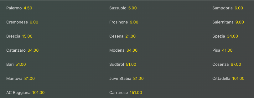 Ecco le quote per la promozione in Serie A, aggiornate al 21 agosto 2024: