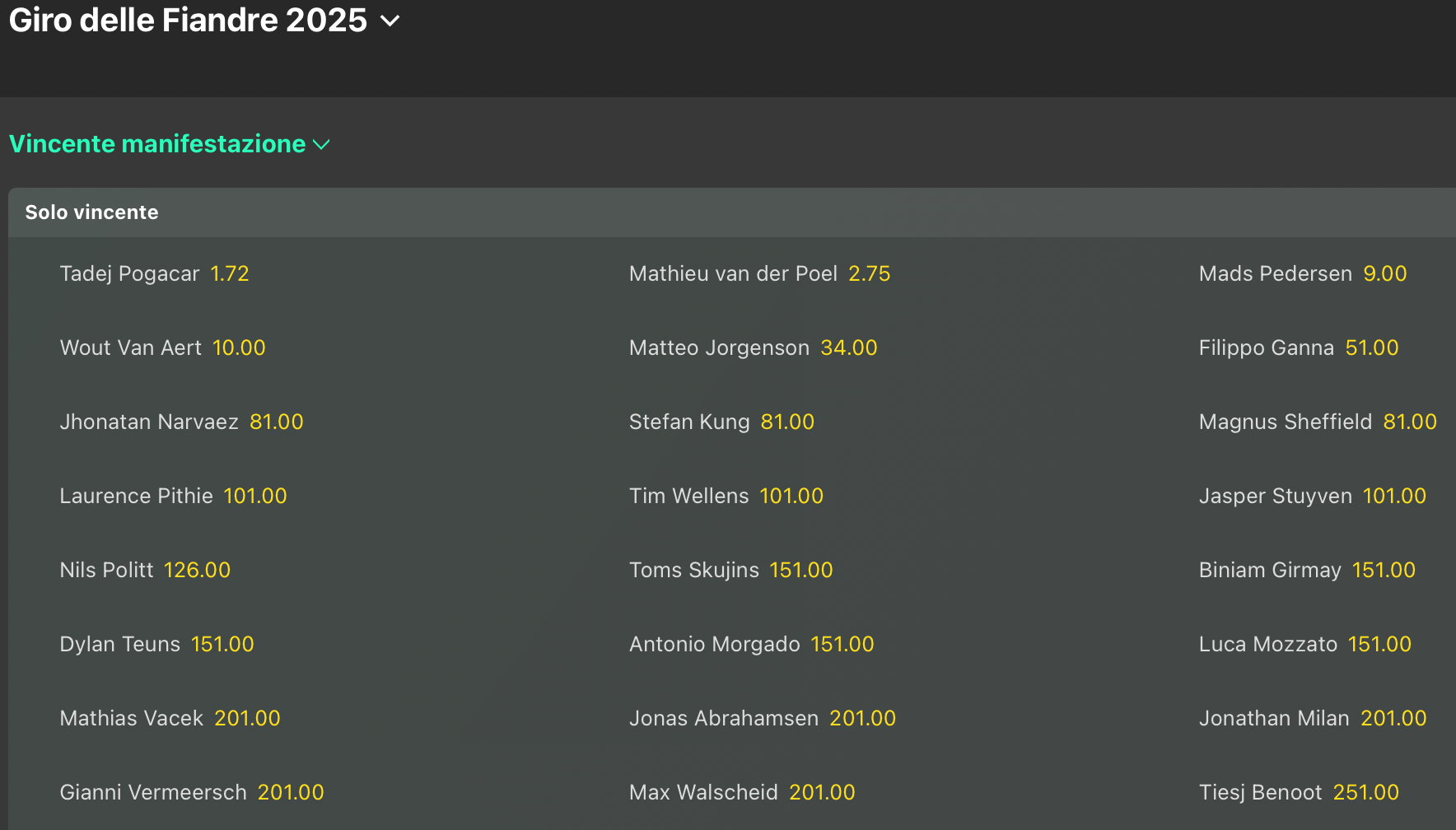 Ovviamente non mancano i big come il campione in carica Mathieu van der Poel (Alpecin-Deceuninck) che ha vinto l’edizione del 2024, Tadej Pogacar (UAE Emirates) , vincitore nel 2023 e grande favorito per il bis nel 2025 come vedremo dopo nelle quote, e anche il nostro Filippo Ganna (Ineos Grenadiers) che ha dimostrato alla Milano-Sanremo il suo valore. In seconda fila anche Mads Pedersen (Lidl Trek).