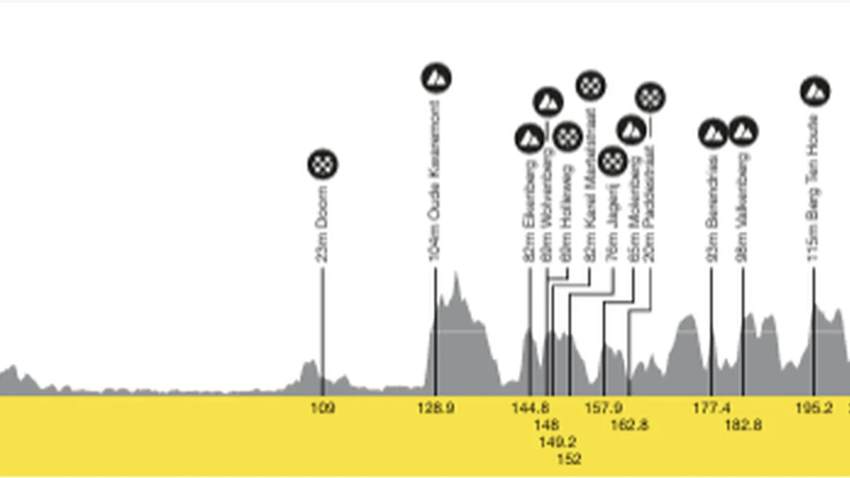 - Al km 195.2 Berg Ten Houte: 1.1 km al 6% (picco al 21%);