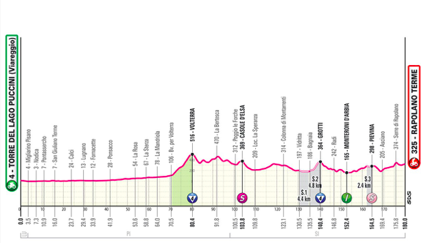 È il giorno dello sterrato con tre diversi settori e un totale di 11,6 km. Si corre in provincia di Siena. Dopo i primi 80 km abbastanza semplici, la situazione cambierà con la salita di Volterra (8,6 km al 4,7%), dopo la quale ci sarà un saliscendi continuo fino al traguardo. I primi due settori di sterrato arrivano a 50 km dal traguardo e sono in rapida successione: Bagnaia (4,4 km). Il secondo porterà anche al GPM di Grotti (3,3 km al 4,9%). Il terzo settore di sterrato verrà affrontato a 18 km dal traguardo e misura 2,4 km. Nel finale occhio allo strappo di Serre di Rapolano, dove la strada è stretta e ci sono punte al 20%. Termina a 4 km dal traguardo.
