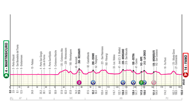 Tappa perfetta per i fuggitivi, considerando i quattro GPM di 4a categoria e tutte le altre salite non classificate come GPM. Primi 50 km abbastanza semplici fino a Civitanova Marche, poi avremo in rapida successione Civitanova Alta, Montelupone e Recanati (primo traguardo volante di giornata). C’è anche Castelfidardo, ma il primo vero GPM è quello di Osimo (7 km al 2,3%, con picco al 4,5%). Monsano (4,2 km al 4%, con picco al 6,2%), Ostra (1 km all’8,8%, con picco al 13,5%), La Croce (2,2 km al 4,2%, con picco al 5,9%) e Mondolfo (1,2 km al 5,1%) saranno decisivi. Nel finale ultimo dentello a Monte Giove, con 1 km di salita con picchi oltre la doppia cifra. Ultimi 10 km poi pianeggianti fino all’arrivo di Fano.