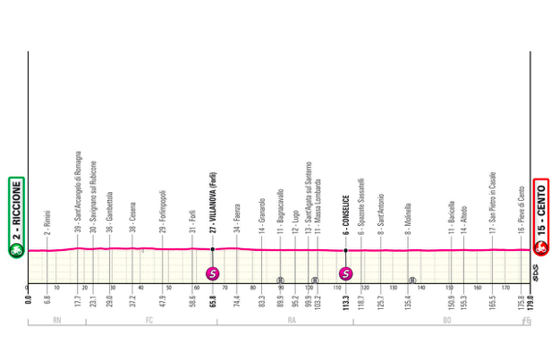 Da Riccione a Cento per una tappa totalmente pianeggiante e dislivello praticamente inesistente. Un invito a nozze per gli sprinter, anche considerando che sarà la terzultima occasione per loro in questa edizione del Giro.