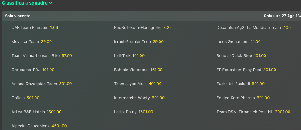 Vediamo le quote antepost per la vittoria finale della maglia rossa alla Vuelta 2024 e le altre lavagne dei premi principali della corsa ciclistica a tappe iberica.