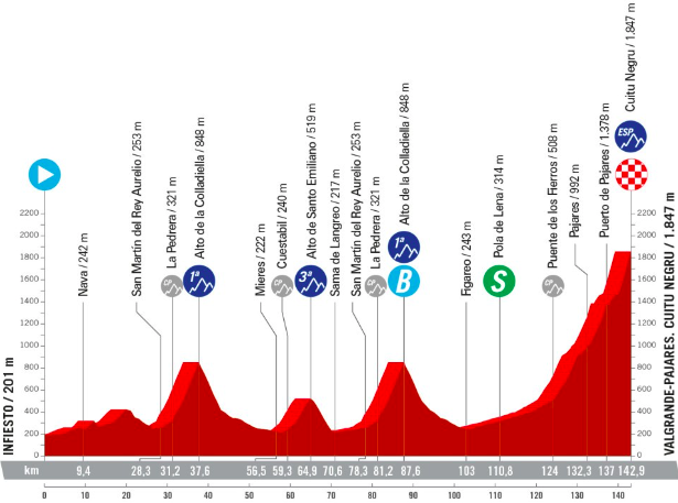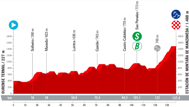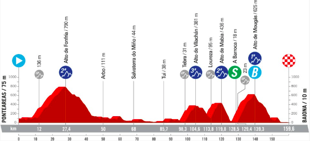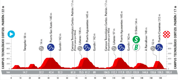 Sono quattro i GPM di questa tappa, uno ogni 30 chilometri. Si parte dal Puerto San Xusto (10,2 km al 4,2%); poi si affronta per due volte il Puerto Aguasantas (5,7 km al 6,1%), prima si passare per lo sprint intermedio di O Sisto. Piccolo tratto pianeggiante e poi l’ultima rampa, il Puerto Cruxeiras, con 2900 metri al 9% costante. Dalla cima saranno 6 km di picchiata verso l’arrivo.