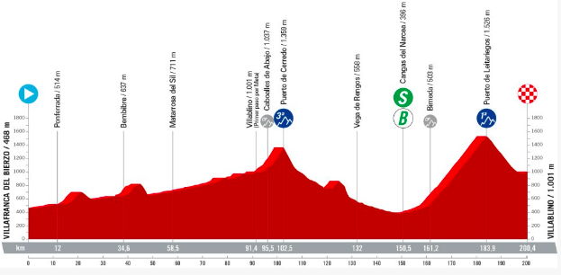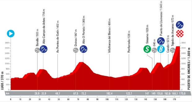Secondo arrivo su un GPM consecutivo ma rispetto al giorno prima qui avremo una tappa dal chilometraggio nettamente maggiore con tre grandi salite che metteranno a dura prova i ciclisti: Alto Campo de Arbre (5 km al 5,8%), Alto O Portelo (7,7 km al 5,4%) e Puerto de Llumeras (6,6 km al 6%). L’ascesa finale sarà quella più tosta: si scala il Puerto de Ancares, che sono 7,5 km al 9,3%. Gli ultimi 5 km infatti non scendono mai sotto la doppia cifra, con diversi tratti costanti al 15%.