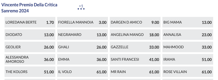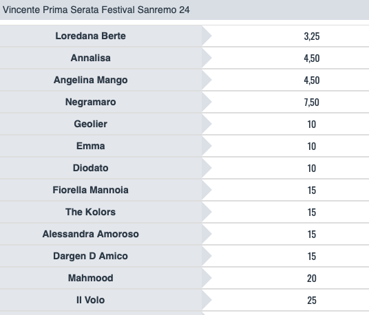 Discorso diverso invece per il co-conduttore della prima serata, il vincitore 2023 Marco Mengoni: alta sia la quota del papillon @4, che di una cravatta, data @4,50, mentre in pole c’è “altro” @1,35.