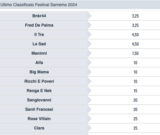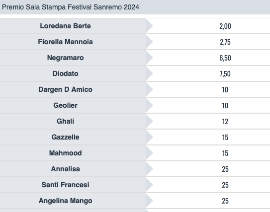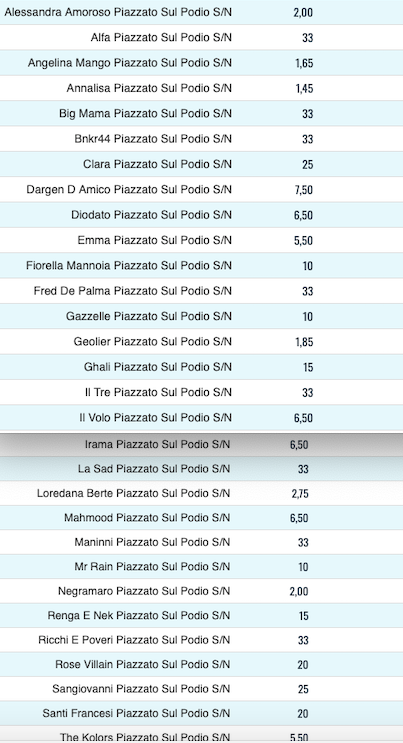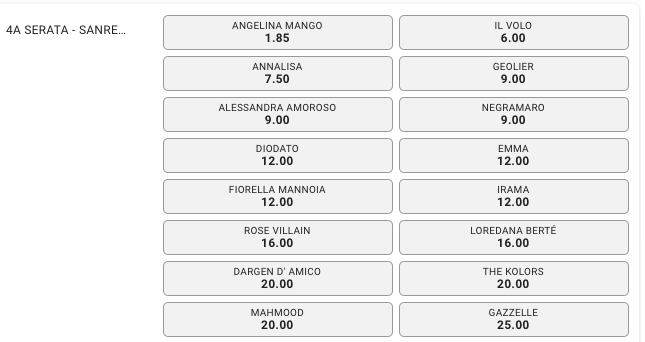 Angelina Mango super favorita su Sisal per la 4° serata, la serata delle Cover dove stacca nettamente tutti, anche il Volo che è il primo avversario della Mango, mentre Annalisa qui si gioca solo 3° a @7.50.