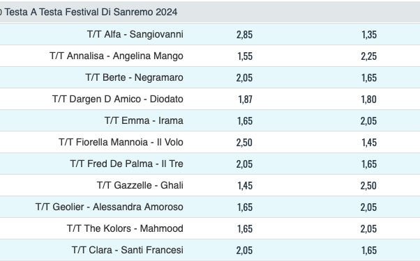 Come sempre i bookmakers si sbizzarriscono con le possibilità di scommesse sul Festival di San Remo. Non solo il semplice vincitore, ma si punta anche sul peggiore, e come abbiamo visto anche su share e outfit oltre che al podio, ai piazzamenti e ai vari testa a testa. Abbiamo fatto una cernita delle quote più interessanti proposte da Snai, Sisal ed Eurobet.
