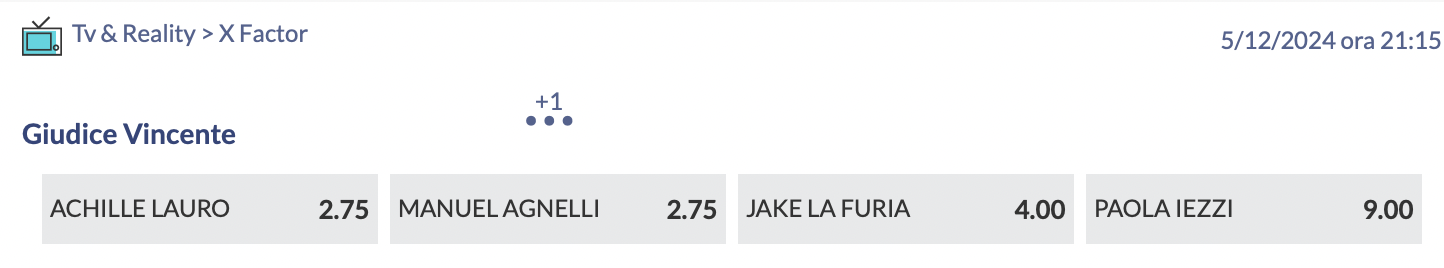 Intanto nelle lavagne delle quote antepost per la vittoria finale, tra i giudici Achille Lauro aggancia Manuel Agnelli tra i favoriti, entrambi @2.75 al momento, mentre si staccano Jake La Furia @4 e Paola Iezzi @9.