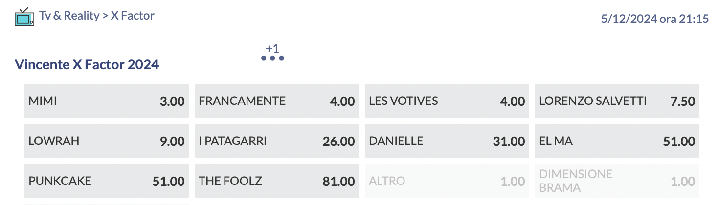 Tra i cantanti Mimi è favorita @3 su Francamente @4, alla pari con Las Votives. Più staccato @7.50 Lorenzo Salvetti e poi Lowrah @9 mentre con I Patagarri si sale in doppia cifra @26 volte la posta.