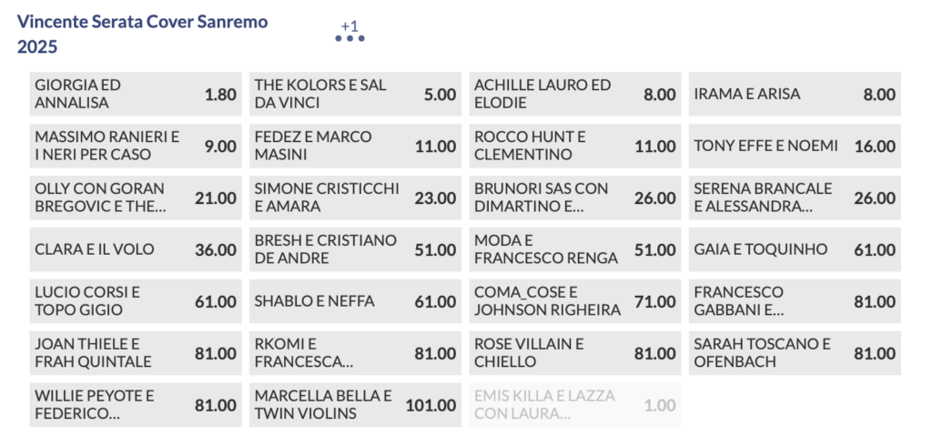 Il vero vincitore della prima serata sembra essere stato Simone Cristicchi che ha conquistato l’Ariston con la prima standing ovation al termine della sua “Quando Sarai Piccola”. La quota per la vittoria crolla da 31 del pre-festival, all’attuale @4, favorito al pari con Giorgia mentre si stacca leggermente Olly @5.50, che era saltato in testa alle lavagne nelle ultime ore prima dell’inizio del Festival.