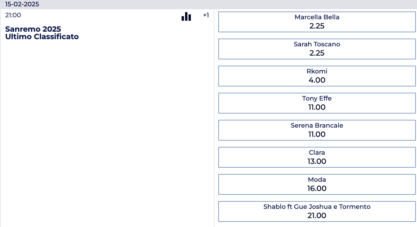 Non mollano la top-5 Achille Lauro e Fedez, le due sorprese (assieme a Lucio Corsi che rimane però staccato @16, un bel crollo rispetto al @201 del pre-festival) che anche in quota tallonano il trio di testa che rimane rappresentato da Giogia @3 e Simone Cristicchi @3.50, con Olly @5.50 poco indietro. Dopo arrivano proprio Achille Lauro e Fedez entrambi @7.50. Brunori Sas rimane più indietro, @16 volte la posta come Corsi, nonostante sui premi della sala stampa sia il principale avversario di Cristicchi.