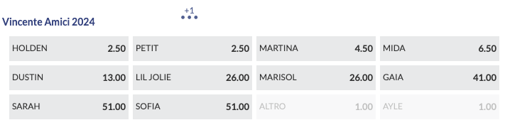 Su Mediaset continua un altro Talent Show molto amato e seguito ormai da decine di edizioni, Amici, e anche qui troviamo un testa a testa nelle lavagne delle quote antepost, con Holden e Petit alla pari @2.50 di quota, incalzati da Martina @4.50 poi troviamo Mida @6.50. Con Dustin @13 si sale in doppia cifra.