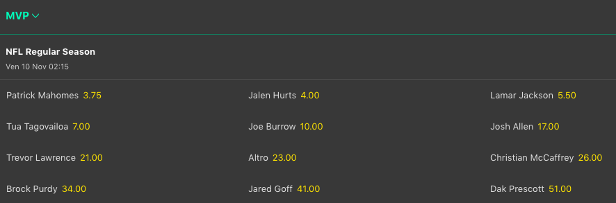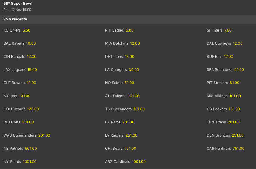 Allo stesso modo scendono anche le quote antepost MVP sul quaterback dei Ravens, Lamar Jackson @5.50, ora dietro solo a Patrick Mahomes @3.75 e a Jalen Hurts @4. Si allontanano invece Tua Tagovailoa @7 e Josh Allen che decolla suo malgrado @17, in mezzo Joe Burrow che invece scende @10.