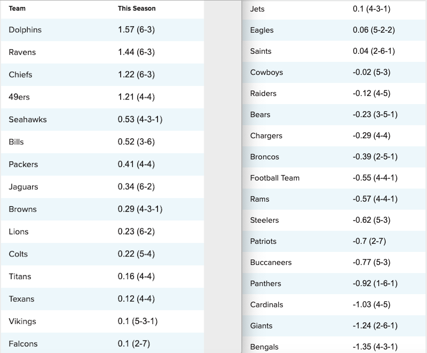 Vediamo le statistiche su migliori e peggiori squadre in Net Yard. Le Net Yard sono un dato molto basilare (le yard prodotte per giocata – le yard concesse per giocata) ma ci danno subito uno spunto valido che ci fa capire il rendimento di una squadra sul campo.