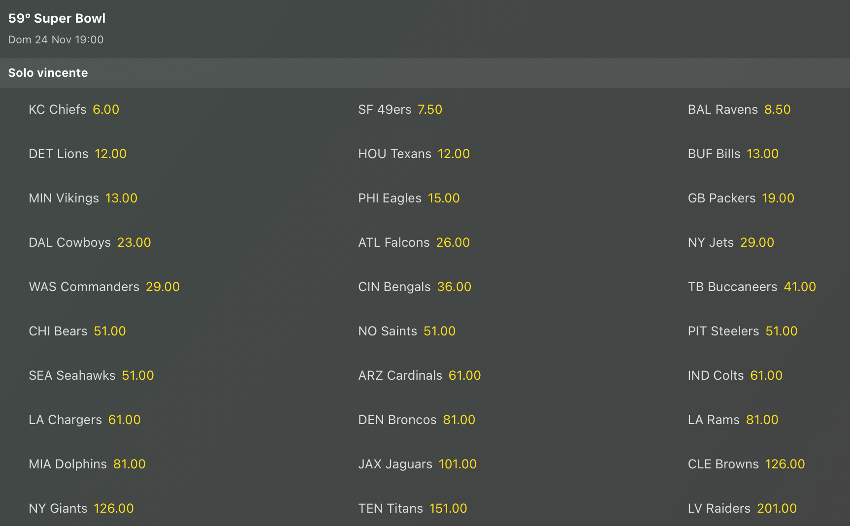 Quote Antepost: gli ultimi aggiornamenti sul 59° Super Bowl