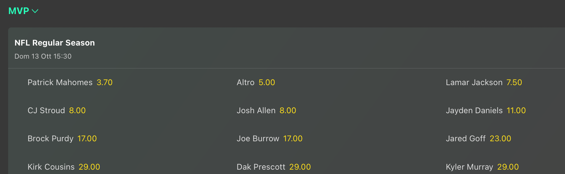 Gli ultimi aggiornamenti delle lavagne antepost NFL per la vittoria finale del 59° Super Bowl e per MVP che rimane sempre una delle lavagne più interessanti da seguire lungo la stagione, e dove torna a dominare in solitaria Patrick Mahomes, con Josh Allen che precipita dopo un paio di settimane in auge. Torna Lamar Jackson per la tripletta ma attenzione anche ai giovani CJ Stroud e il già citato Jayden Daniels, anche se è raro vedere un rookie vincere il premio di MVP.