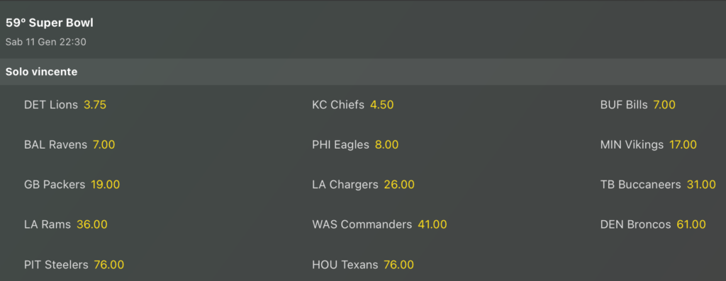 Secondo i bookmakers questo potrebbe essere l’anno buono per i Detroit Lions, favoriti sulle lavagne delle quote antepost per la vittoria finale del 59° Super Bowl della storia NFL, di poco avanti sui Kansas City Chiefs, poi più staccati ci sono Buffalo Bills e Baltimore Ravens entrambe @7 volte la posta, di poco avanti sui Philadelphia Eagles @8, dopodiché si sale in doppia cifra con Minnesota @17.