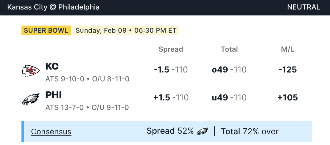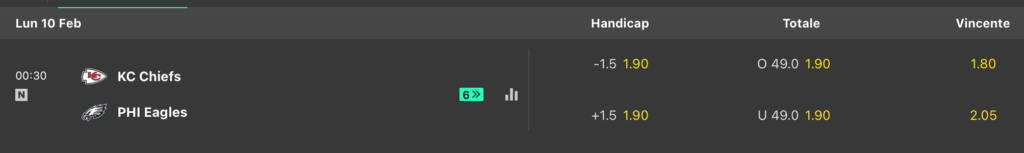 Per il Championship game di NFL i Chiefs aprono leggermente favoriti con -1.5 punti di handicap mentre la vittoria secca in moneyline di KC si gioca @1.80 contro il @2.05 di Philadelphia. Linea O/U che apriva a 48.5 ma è rapidamente salita a 49.0 e pensiamo che da qui al 9 febbraio potrebbe salire ancora arrivando a sfondare il muro dei 50 punti totali. Ecco tutte le quote principali del Big Game.