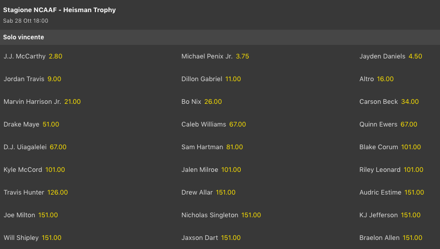 Stessa cosa per Heishman Trophy dove troviamo proprio il QB dei Wolverines, J.J. Mc Carthy @2.80, nuovo favorito davanti al nostro Michael Penix Jr. che sale @3.75, e su cui facciamo il tifo visto che lo abbiamo preso settimane fa quando si giocava @6.50.
