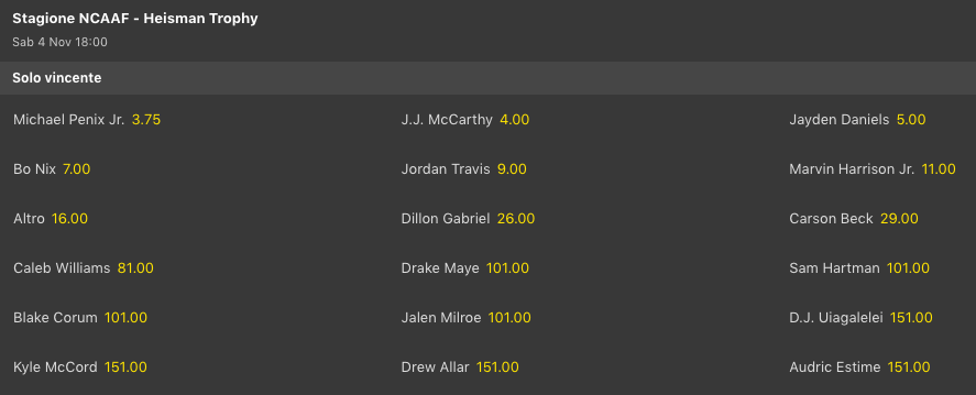 Pronostici College Football NCAAF Week 10: Quote Antepost
