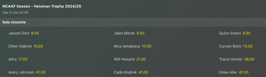 La vittoria di solo 1 punto della settimana scorsa fa scendere l’ottimismo con Georgia che si vede avvicinata da Ohio State nelle quote antepost per la vittoria finale del titolo nazionale NCAAF, con Texas pronta ad inserirsi, ed Alabama che è sempre un programma da tenere in considerazione. Variazioni anche sulla lavagna per l’Heishman Trophy.