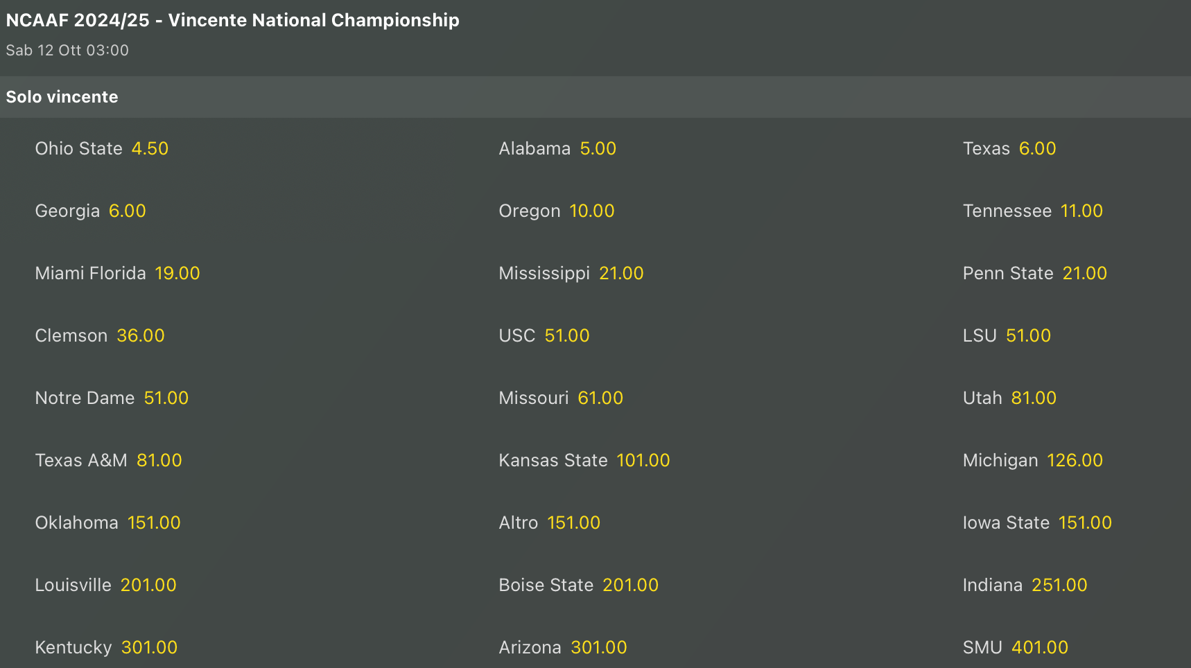 Come ogni settimana chiudiamo vedendo gli ultimi aggiornamenti delle quote antepost per la vittoria finale del Titolo Nazionale NCAAF e anche per l’Heishman Trophy, ovvero il miglior giocatore dell’anno.