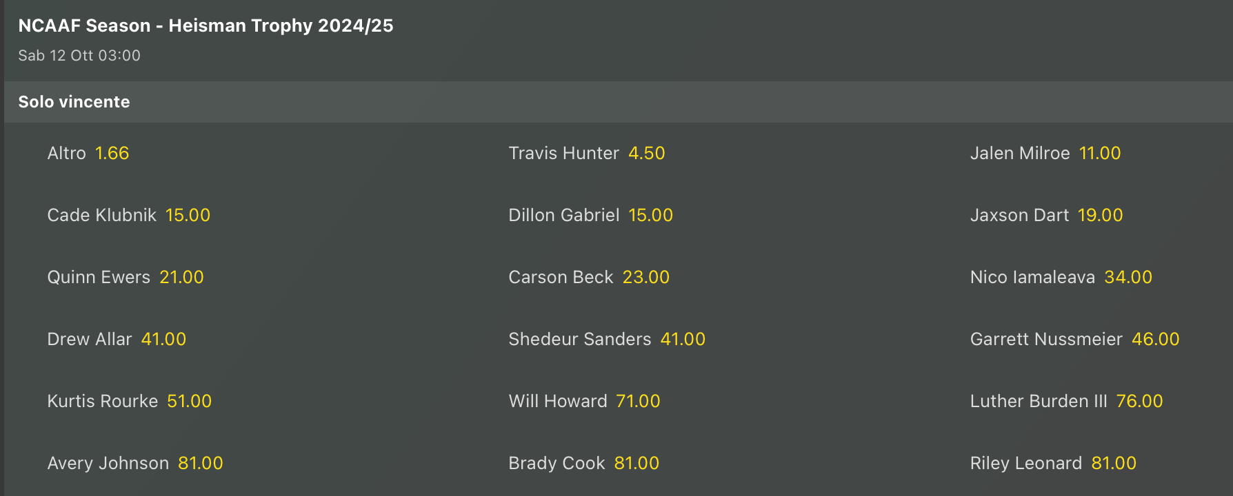 Tanti stravolgimenti, con Ohio State che balza in testa dopo il clamoroso ko di Alabama la settimana scorsa. Ribaltone anche per l’Heishman dove dal nulla salta fuori Ashton Jeanty come nuovo favorito davvero a sorpresa (e che in Italia si gioca in quota Altro @1.66). Travis Hunter rimane il principale avversario, mentre in stacca in doppia cifra Jalen Milroe. Rimane viva anche l’opzione Dillon Gabriel, raggiunto da Cade Klubnik.