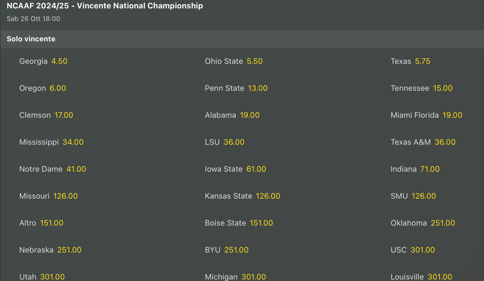 Quote Antepost NCAAF: gli ultimi aggiornamenti