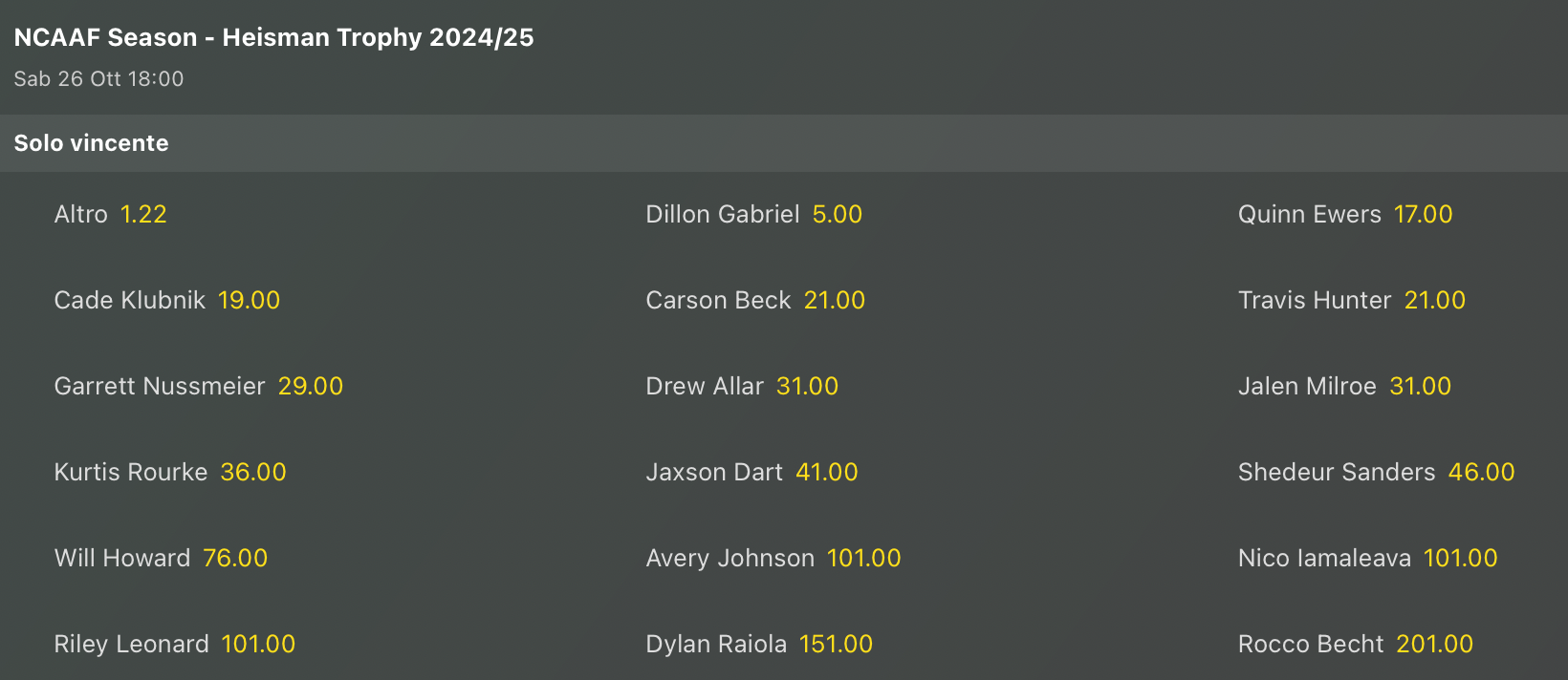 Oregon ha la #1 nel ranking, ma è solo 4° nelle lavagne, anche se molto vicina alle prime della classe, mentre con Penn State si sale in doppia cifra. Dillon Gabriel torna a prendere quota per l’Heishman, anche se Ashton Jeanty (in quota altro @1.22) rimane favorito.