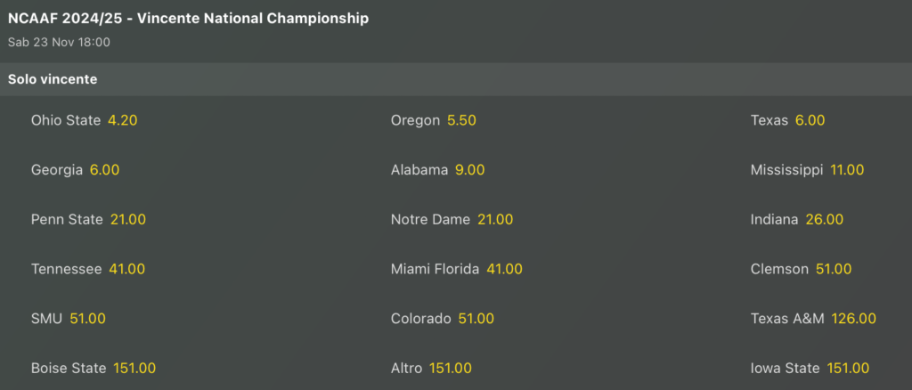 Per il titolo nazionale Ohio State rimane la squadra da battere, ma Oregon è molto vicina, così come Texas agganciata da Georgia e poi abbiamo anche Alabama tra le contender. Risale anche Mississippi in 2° fascia con quota a 11 volte la posta.