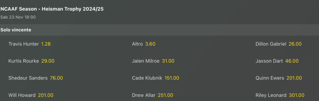Per l’Heishman Trophy la brutta prova dei Ducks si riflette anche sulle quote per il QB di Oregon, Dillon Gabriel, che in una sola settimana passa da 4 alla quota di 26 per la vittoria finale, con Travis Hunter @1.25 sempre più favorito, e che stacca anche Ashton Jeanty che troviamo in quota altro a 3.60.