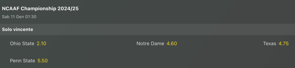 Ad ogni modo anche qui ci aspettiamo una partita da UNDER su linea 53.5 punti totali, ma rispetto all’altra partita qui abbiamo qualche dubbio in più, perchè sono attacchi che possono accendersi sempre. Attenzione anche agli sfavoriti, forse i Buckeyes passeranno in finale (e probabilmente porteranno a casa il titolo nazionale, sono anche i favoriti dalle quote antepost come vedremo dopo), ma non li vedo cosi favoriti sui Longhorns che potrebbero coprire con un TD in appoggio come spread (TEXAS +7.0). Ovviamente queste sono solo prime idee, e per le scommesse ufficiali ci risentiamo nei prossimi giorni sui nostri canali Telegram (trovi tutti i riferimenti in fondo a questo articolo).