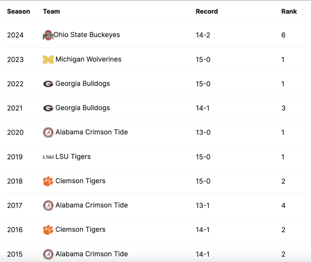 La squadra #1 del ranking ad inizio stagione ha vinto solo 4 degli ultimi 11 National Championships. Solo 2 squadre fuori dalle principali conference (SEC, Big Ten, Big 12, ACC) hanno giocato una finale, Oregon nel 2014 e Washington lo scorso anno). Ecco gli ultimi vincitori della NCAAF: