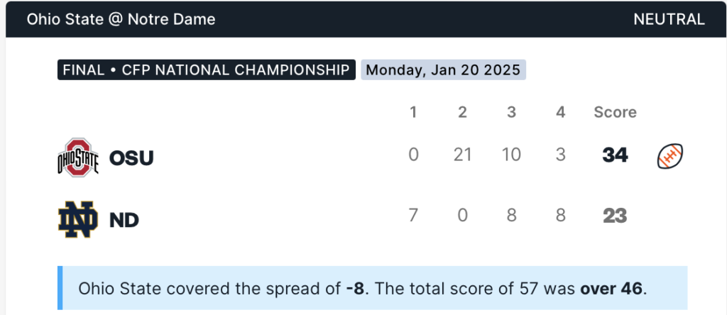 Will Howard (17/21, 231, 2TD) ha giocato una finale quasi perfetta, assieme ai 3 TD di Quinshon Judkins nel successo sui Fighting Irish che erano arrivati fino a questo punto un pò a sorpresa, ma da sfavoriti con 8.5 punti di spread, un handicap alto per una finale del genere, che Notre Dame non è riuscito nemmeno a coprire.