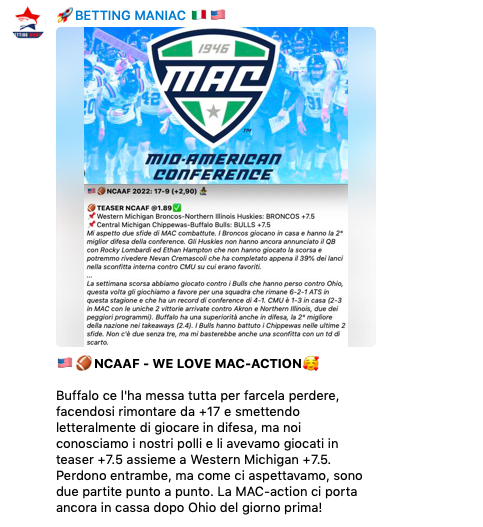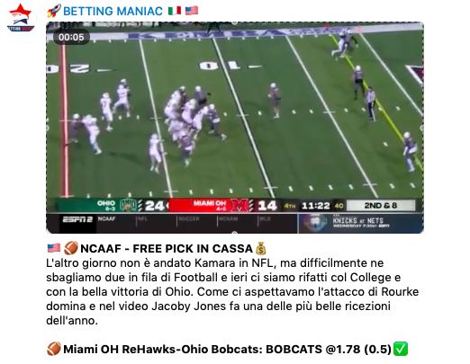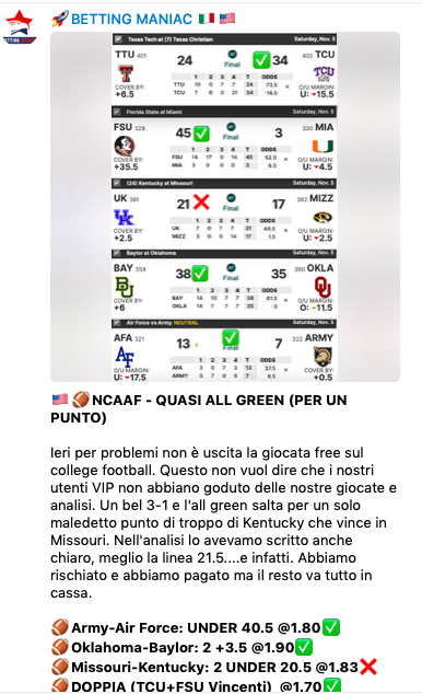 Segui il nuovo canale BETTING MANIAC su Telegram. Accedi da QUI al canale gratuito e se ti piace il nostro lavoro, e vuoi ricevere tutti i contenuti quotidiani di 7 tipster su tutti gli sport, entra nel VIP con le nostre promozioni speciali. Entri gratis, o con meno di un caffè al giorno! Inizia a vincere con noi ed approcciati alle scommesse in modo più professionale.