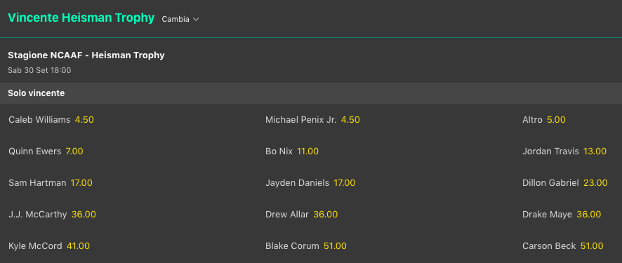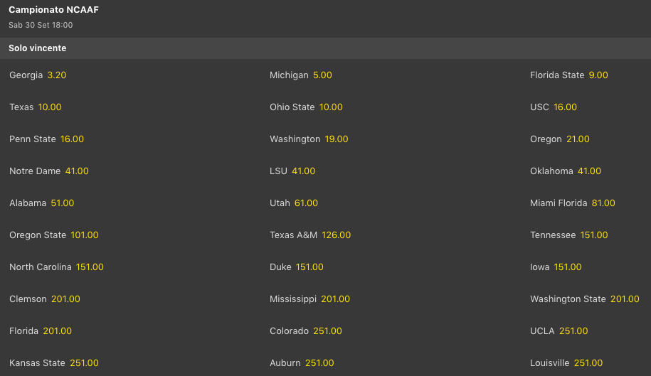 Georgia @3.20 rimane davanti a tutti per la vittoria del titolo nazionale, sarebbe il 3° di fila. Michigan @5 rimane la principale avversaria, poi c’è Florida State @9. In doppia cifra Texas @10 assieme a Ohio State @10 poi c’è USC con Penn State @16. La squadra di Penix Jr, Washington @19, è un pò più indietro. Guadagna posizioni anche Oregon @21 mentre scende Notre Dame @41.