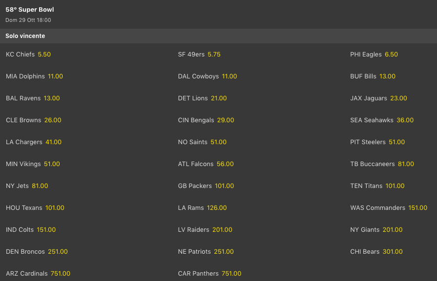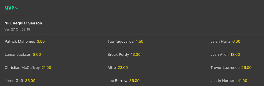 Da una parte i Kansas City Chiefs @5.50 sono i nuovi favoriti per il Super Bowl 58, scavalcando i San Francisco 49ers che hanno perso le ultime 2 partite, dall’altra il loro QB, Patrick Mahomes, si riprende la testa delle lavagne per le scommesse antepost sul MVP della regular season, superando Tua Tagovailoa che arriva da un ko con i suoi Miami Dolphins nel big match contro i Philadelphia Eagles che risalgono, come risale anche il QB Jalen Hurts per MVP. La squadra della settimana è Baltimore che ha dominato anche contro Detroit, e sale tra i contender del MVP anche Lamar Jackson che sta guidando molto bene l’attacco dei Ravens.