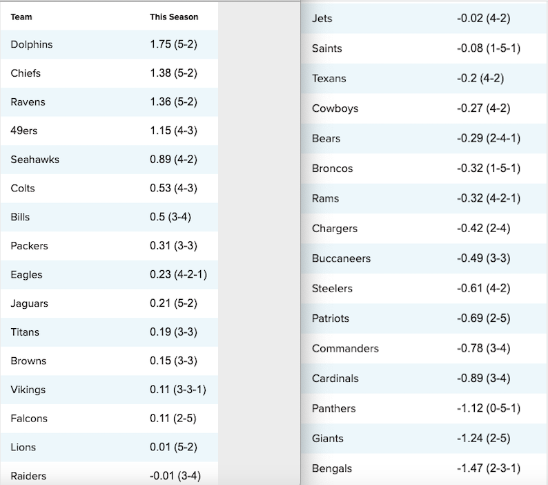 Le Net Yard sono un dato molto basilare (le yard prodotte per giocata – le yard concesse per giocata) ma ci danno subito uno spunto valido che ci fa capire il rendimento di una squadra sul campo, e conti alla mano i Miami Dolphins rimangono i migliori. Tua e compagni guadagnano mediamente +1.75 yard rispetto agli avversari per ogni giocata, ma c’è una differenza sull’incredibile rendimento interno (+3.23) rispetto a quello modesto in trasferta (+0.76). La migliore squadra in trasferta è quella dei Kansas City Chiefs con +1.58, ma Mahomes e compagni dividono quasi perfettamente il rendimento positivo anche in casa (+1.19) e questo li rende al momento al 2° posto complessivo (+1.38).