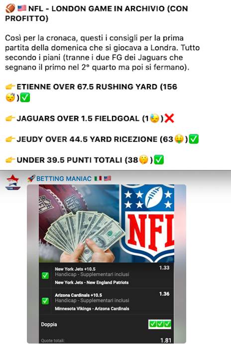 Segui il nuovo canale BETTING MANIAC su Telegram. Accedi da QUI al canale gratuito e se ti piace il nostro lavoro, e vuoi ricevere tutti i contenuti quotidiani di 7 tipster su tutti gli sport, entra nel VIP con le nostre promozioni speciali. Entri gratis, o con meno di un caffè al giorno! Inizia a vincere con noi ed approcciati alle scommesse in modo più professionale.