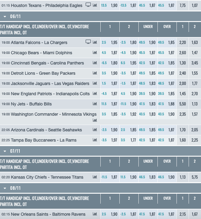 Pronostici NFL Week 9. La nuova settimana di Football Americano inizia col Thursday Night tra Houston Texans-Philadelphia Eagles, praticamente il meglio contro il peggio della lega al momento. Il grosso delle partite si giocano domenica, fino al Sunday Night tra Kansas City Chiefs-Tennessee Titans. Il Monday Night vedrà di fronte New Orleans Saints-Baltimore Ravens.