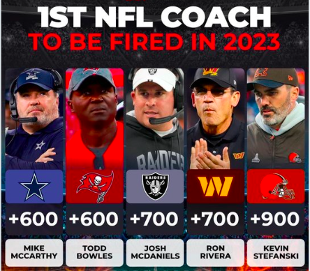 L’altra squadra che non parte benissimo è quella dei Dallas Cowboys, non fosse altro per il fatto che tra i coach favoriti ad essere i primi esonerati ci sia proprio Mike McCarthy davanti a tutti (assieme a Todd Bowles dei Buccaneers). Poco più indietro troviamo Josh McDaniels dei Raiders e Ron Rivera a Washington.