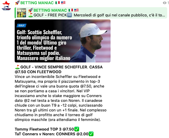 Ci abbiamo creduto con Jon Rham, ma alla fine è stato ancora una volta Scottie Scheffler, con una domenica impressionante, a portarsi a casa un torneo importante, questa volta l’oro alle Olimpiadi di Parigi 2024. Noi ne usciamo comunque in profitto grazie allo stake maggiore giocato sul testa a testa di Conners che chiude a -9 contro il +1 di Noren nel VIP, ma anche la top-3 di Fleetwood che vince l’argento e che vi avevamo segnalato anche nel free in quota @7.50. Ora tocca al torneo femminile alle Olimpiadi dove abbiamo dato due consigli sulle possibili vincenti che trovate QUI. L’ultimo torneo del PGA è stato invece il 3M Open dove è tornato a vincere Jhonattan Vegas ad anni di distanza dal suo ultimo successo al PGA.