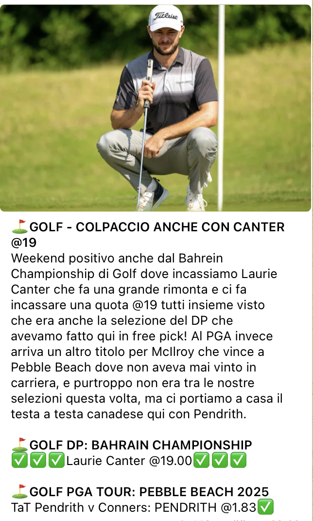 Pronostici Golf 6-9 febbraio 2025: risultati di una settimana vincente