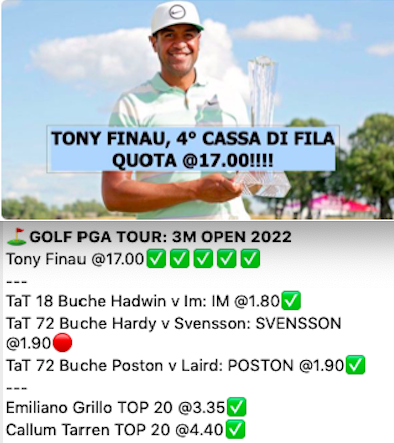 Non ci fermiamo più! Succede di tutto nel finale del 3M Open. Piercy esplode, ne approfitta TONY FINAU che avevamo consigliato anche in FREE PICK. Non è l’unico bel colpo visto che per non farci mancare nulla avevamo anche Grillo e Im nelle nostre selezioni, vale a dire dal 1° al 3°. Bel piazzamento in top-20 anche per Tarren. Con le scommesse sul golf rimaniamo su un altro pianeta.