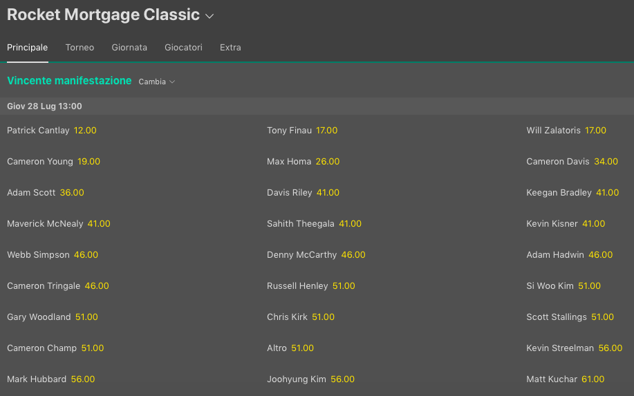 Come già detto la settimana scorsa ha vinto Tony Finau e noi abbiamo incassato. Questa settimana il PGA Tour fa tappa a Detroit per il Rocket Mortgage Classic giunto alla 4° edizione, e con un field di tutto rispetto, aperto dai favoriti delle lavagne degli Sportsbook: Patrick Cantlay, Will Zalatoris, Tony Finau, Cameron Young, Max Homa e Kevin Kisner.