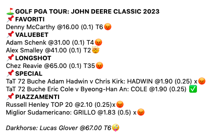 La settimana scorsa Sepp Straka ha vinto il John Deere Classic, torneo in cui non ci è bastato fare una serie di selezioni ottime, di giocatori a quota alta che hanno centrato la top-10, penso ad Alex Smalley @41 che ha chiuso al 2° posto, il 4° posto di Adam Schenk @31 o i T6 di Denny McCarthy @16 e perfino del darkhorse Lucas Glover @67.