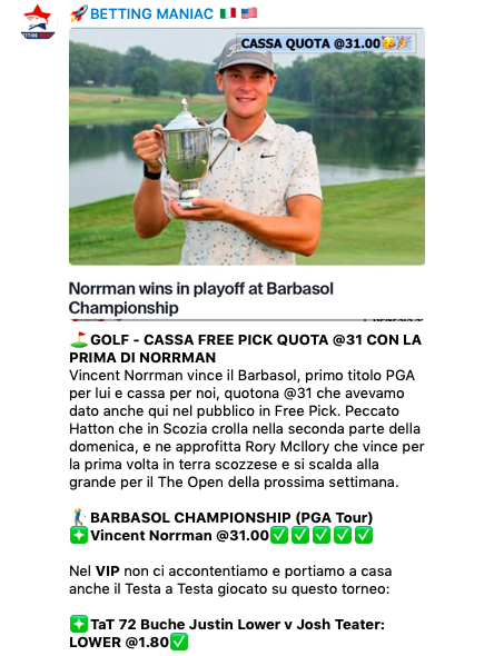 La settimana scorsa siamo tornati a battere un colpo vincente con la cassa quota @31.00 su Vincent Norman dato anche come free pick. Peccato invece al Open di Scozia dove avevamo molti giocatori ai piani alti, ma che si sono arresi a Rory McIlroy.