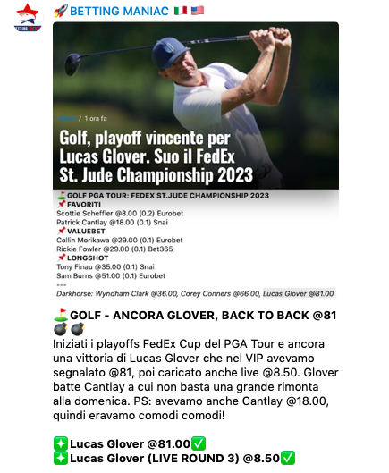 La settimana scorsa è arrivato il back to back inatteso di Lucas Glover, che poi tanto inatteso non era visto che lo avevamo consigliato come darkhorse @81 di quota, da tenere sott’occhio, e dopo i primi 2 giri ottimi lo abbiamo caricato anche live nel nostro canale TELEGRAM VIP di Betting Maniac, quindi siamo riusciti a recuperare tutto il maltolto nelle scommesse del primo evento dei playoffs FedEx Cup, anche se preferivamo Patrick Cantlay che avevamo scommesso @18 di quota, ma che si è arreso a Glover nelle biche extra, dopo aver chiuso con lo stesso score.