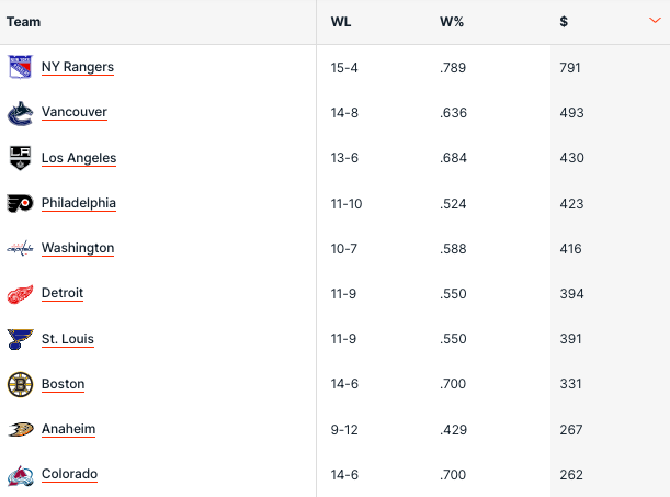 I NY Rangers con +7.91 unità di profitto sono nettamente la miglior squadra nelle scommesse, staccando nettamente Vancouver (+4.93) ed LA Kings (+4.30). Sale al 4° posto Philadelphia (+4.23) poi troviamo un pò a sorpresa Washington (+4.16) a completare la top-5.
